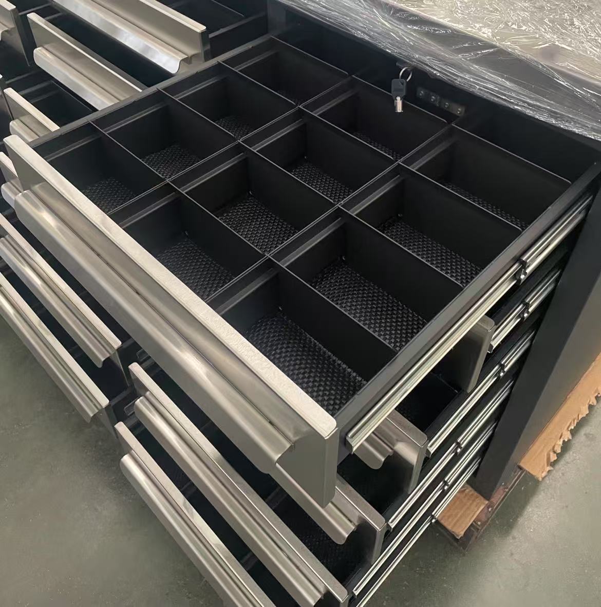 علاوة على ذلك ، تم تزويد الأدراج بفواصل قابلة للتعديل ، مما يمكّن المستخدمين من تخصيص التصميم الداخلي وفقًا لحجم ونوع أدواتهم. هذا نظام التقسيم القابل للتكيف لا يزيد من استخدام المساحة إلى الحد الأقصى ولكنه يعزز أيضًا تنظيمًا أفضل ، مما يجعل استرداد الأدوات أسرع وأكثر سهولة.