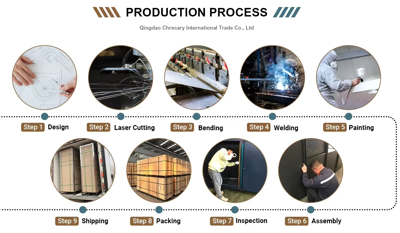 1. شراء المواد الخام: يتم اختيار لوحات فولاذية عالية الجودة مدفوعة البرد بعناية كمواد رئيسية للتأكد من أن قوة المادة ومتانة تلبي معايير عالية. في الوقت نفسه ، يتم شراء العديد من المواد المساعدة عالية الجودة ، مثل شرائح تحمل الكرات للأدراج والأقفال والعجلات.